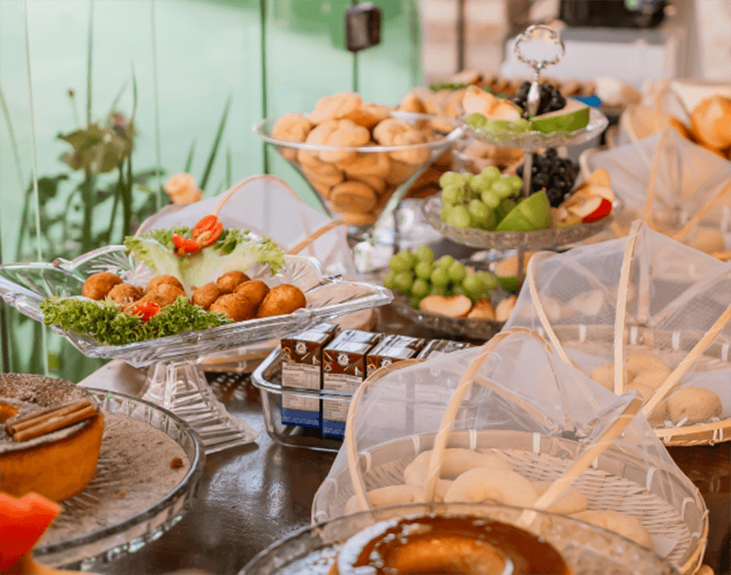 Nosso café da manhã é um dos mais completos da região, e no menu você encontra o famoso pão de queijo mineiro, feito na nossa cozinha, além de bolos caseiros, como o de fubá.